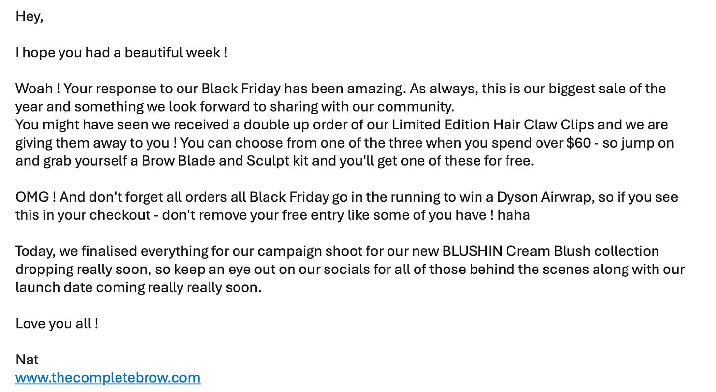 Nat from The Complete Brow takes a different approach. The email isn’t personalised, but it does reaffirm the community, not missing out and also makes liberal use of exclamation marks. Unlike the first, it points towards new products to keep an eye out for, maintaining the momentum and interest.