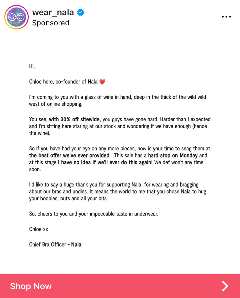 Now, I’ve never bought from Nala, but they have paid for a post to be shared that explains that the co-founder is stress drinking wine because people have bought too much stuff on sale! This is a really classy way to share the same message of those shouty ‘never to be repeated/Kent Bruce has gone mad’ ads.[2]