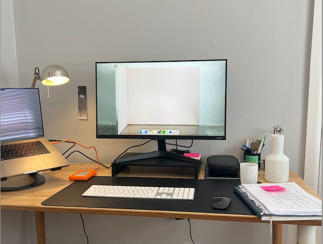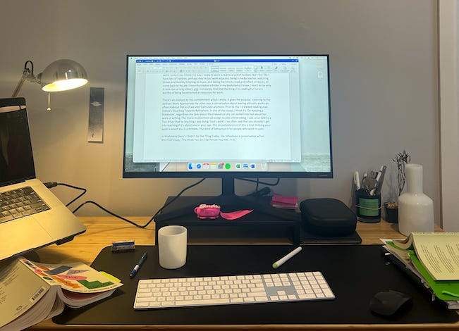 Teaching is not a job that lends itself to hybrid work situations. Due to this, I have two workspaces, the one I have been given at work, and the one I have set up at home. Both see me do work for my job and work for this newsletter. To set myself up in either place seems to require several things, power cords, changing internet proxies, mice and keyboards, the laptop the stand, the lists I previously mentioned. Then to teach I cart all these things around with me, ensuring I have a pencil case with bits of tat, a water bottle and any of the other ridiculous things I get asked for. They are not crucial to doing the work but are a part of the job. The classroom I teach in most of the time also has cabinets full of anything we (the students or myself) may need. Some of these items are more crucial like cameras for filming. The work itself is then dependant on the space. And the space needs to be able to cater for the work.